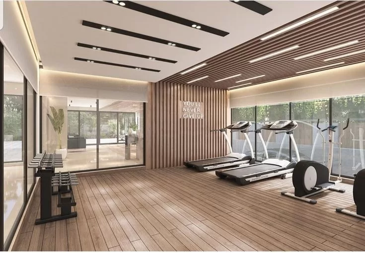 Dan gambar terakhir menampilkan Ruangan yang terlihat luas dan tertata rapi dengan lantai berwarna gelap yang memberikan kontras yang menarik terhadap dinding berpanel kayu dan aksen batu di dinding belakang ruangan gym yang sangat luas, terdapat banyak alat gym disana. Lantai yang digunakan merupakan lantai vinyl